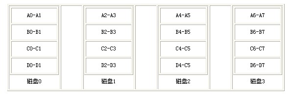 数据按需要分段,从第一个磁盘开始放,放到最後一个磁盘再回到第一个磁盘放起,直到数据分布完毕。至于分段的大小视系统而定,有的系统或以1KB最有效率,或以4KB,或以6KB,甚至是4MB或8MB的,但除非数据小于一个扇区(sector,即521bytes),否则其分段应是512byte的倍数。因为磁盘的读写是以一个扇区为单位,若数据小于512bytes,系统读取该扇区后,还要做组合或分组(视读或写而定)的动作,浪费时间。从上图我们可以看出,数据以分段于在不同的磁盘,整个阵列的各个磁盘可同时作读写,故数据分段使数据的存取有最好的效率,理论上本来读一个包含四个分段的数据所需要的时间约=(磁盘的accesstime+数据的transfertime)X4次,现在只要一次就可以完成。